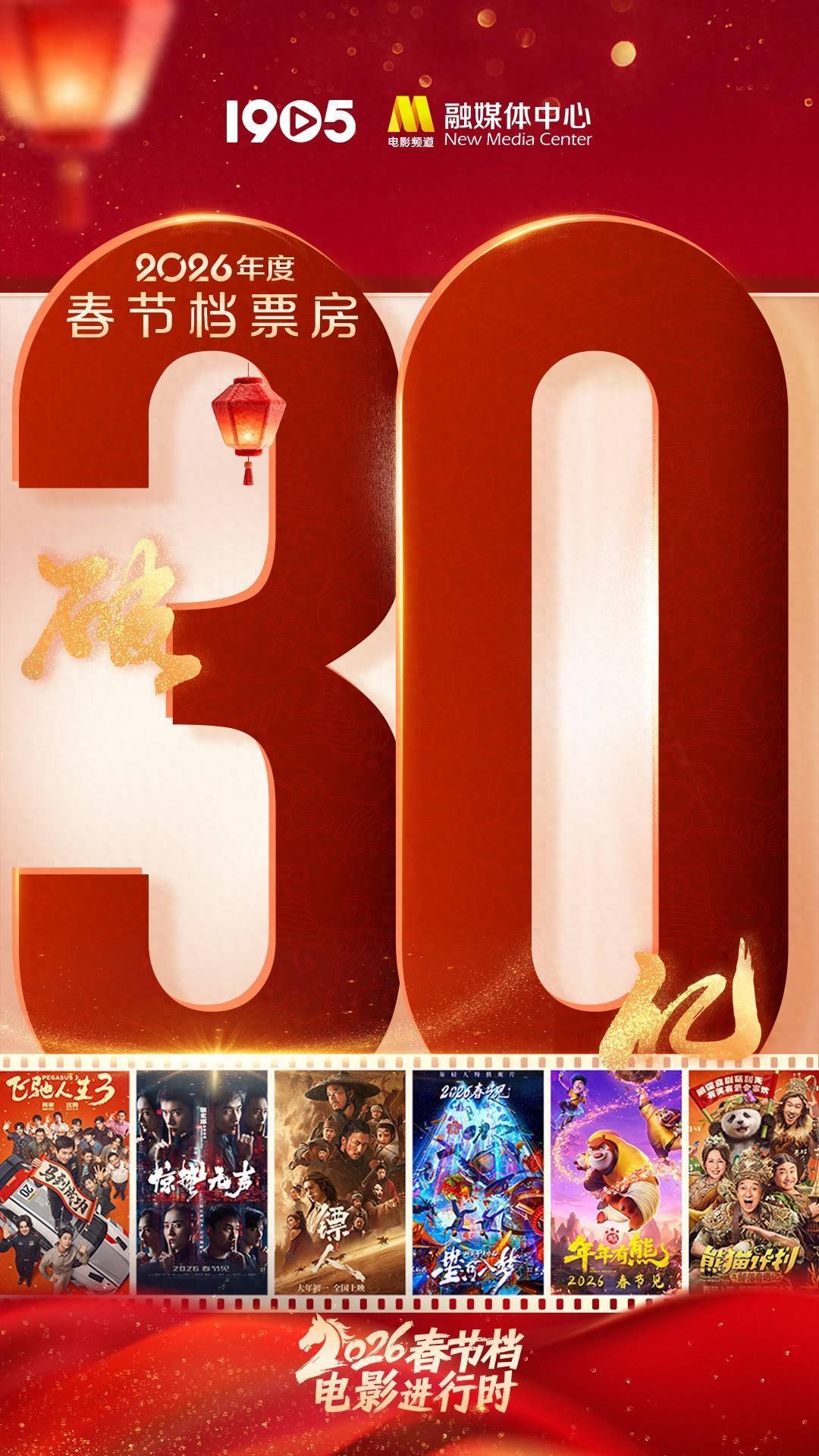 1905电影网讯截至2月19日大年初三19时27分,2026年春节档票房(含预售)已突破30亿元!热映仍在继续,期待更多惊喜!