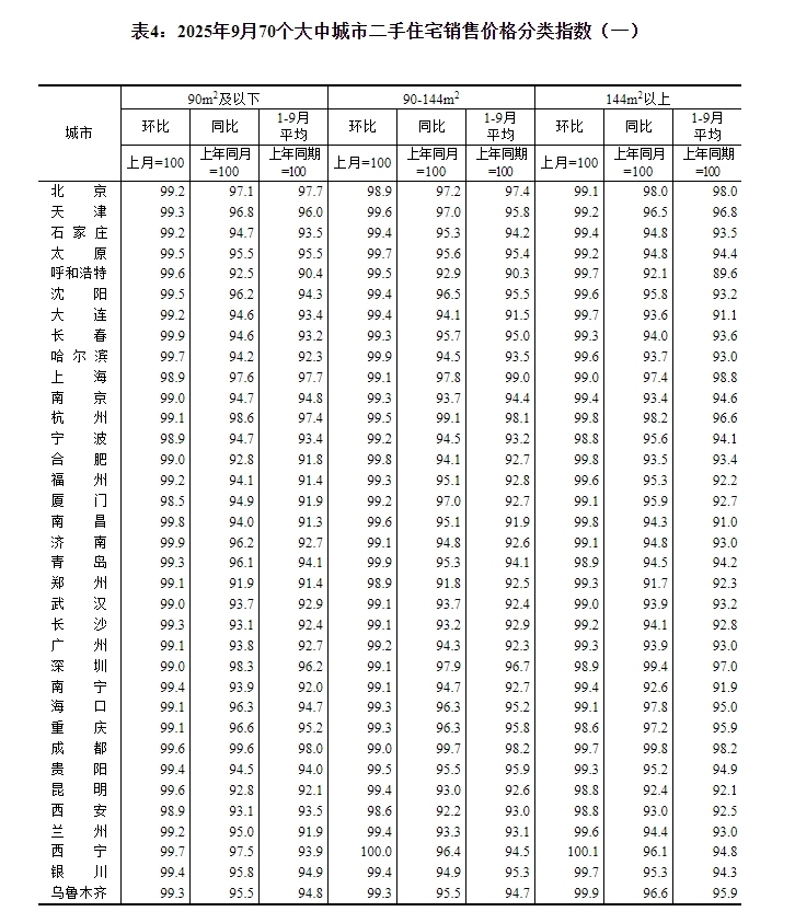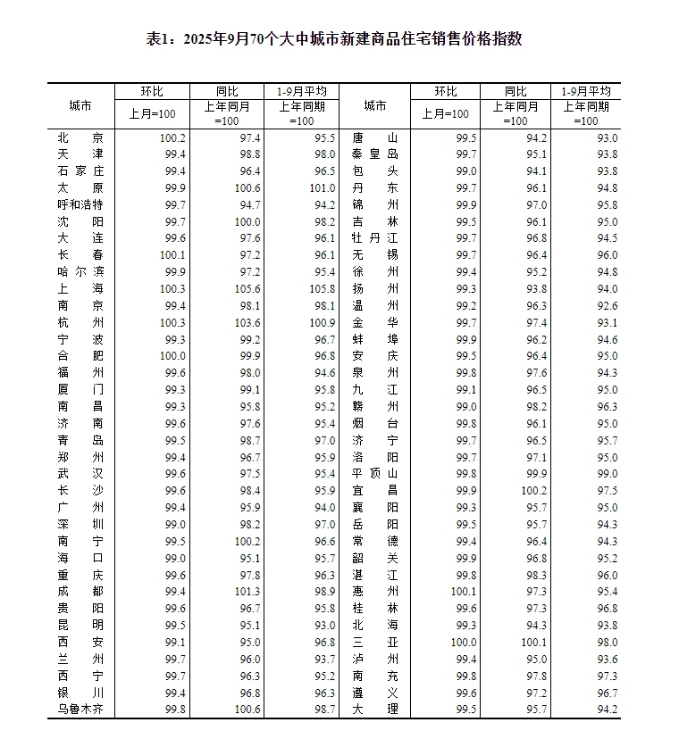 2025年9月份,70个大中城市中,各线城市商品住宅销售价格环比下降,同比降幅继续呈收窄态势。