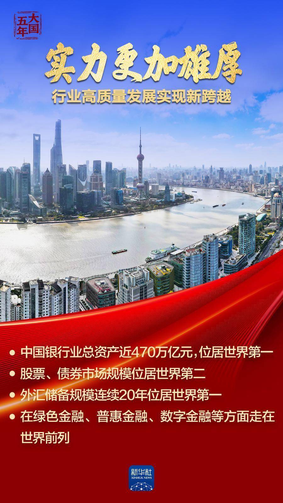 金融是国民经济的血脉。“十四五”时期,我国加快构建中国特色现代金融体系,牢牢守住系统性风险安全底线,为高质量发展注入磅礴动能。银行业总资产近470万亿元,稳居世界第一;股票、债券市场规模全球第二,彰显市场深度;五年间为实体经济提供新增资金170万亿元,畅通高质量发展血脉……